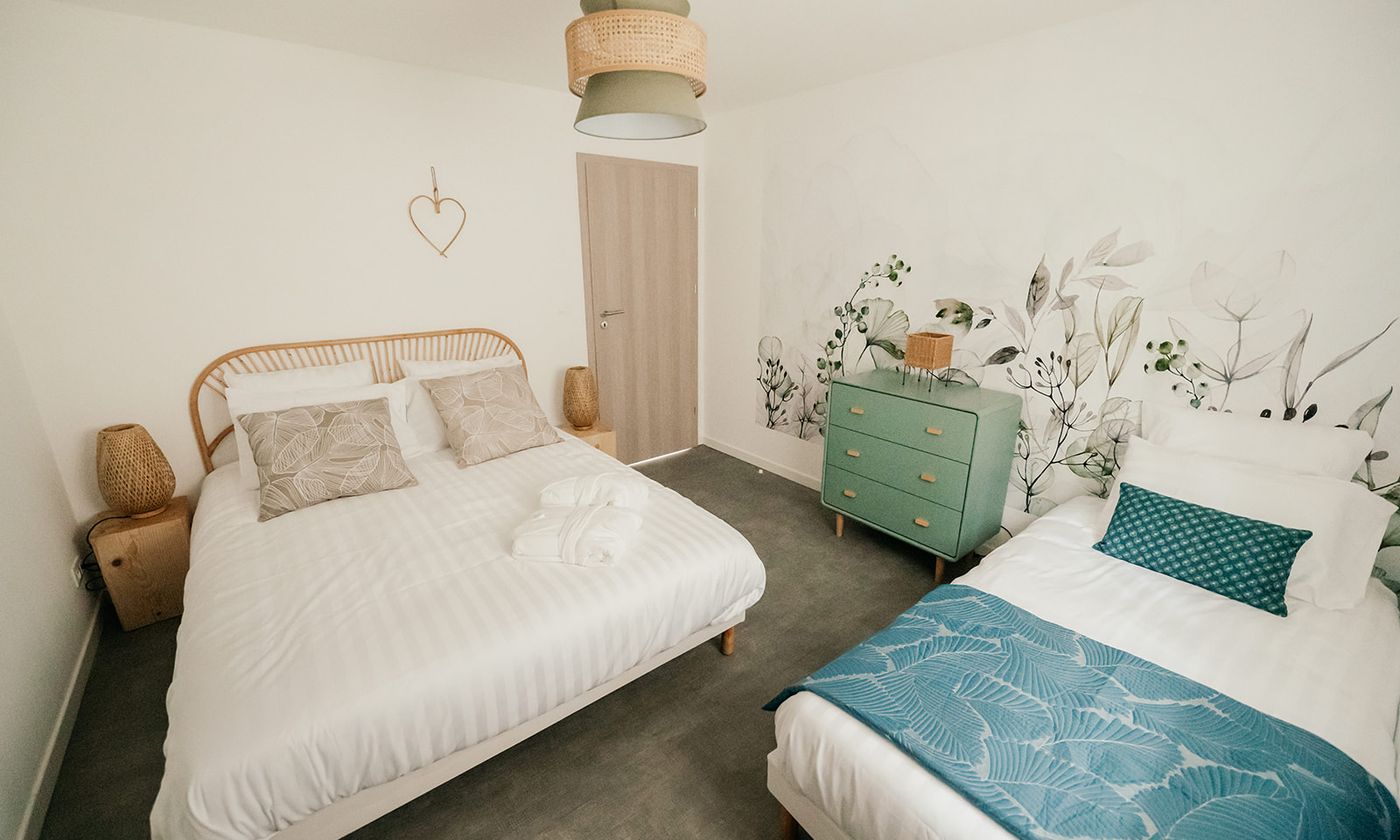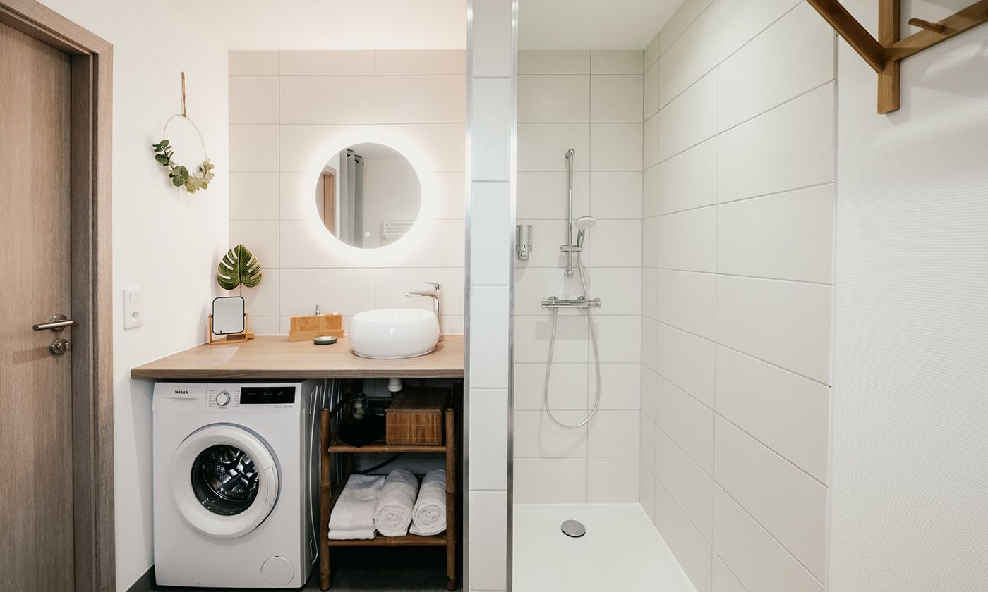 Chaque gîte bénéficie également d’une terrasse privative de 11 m² équipée d’une table, de bancs, d’un parasol LED et d’une plancha, ainsi que d’un espace vert aménagé avec transats.